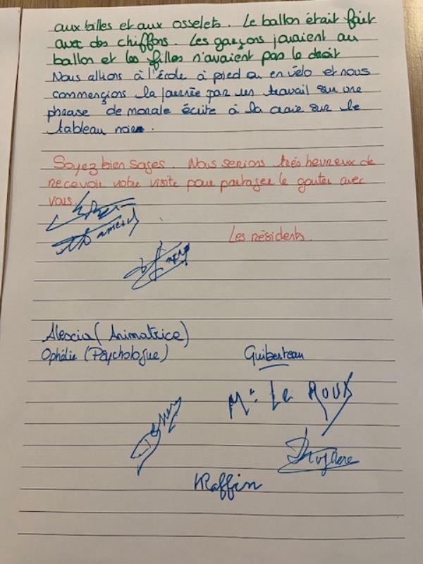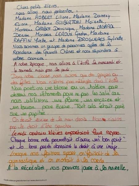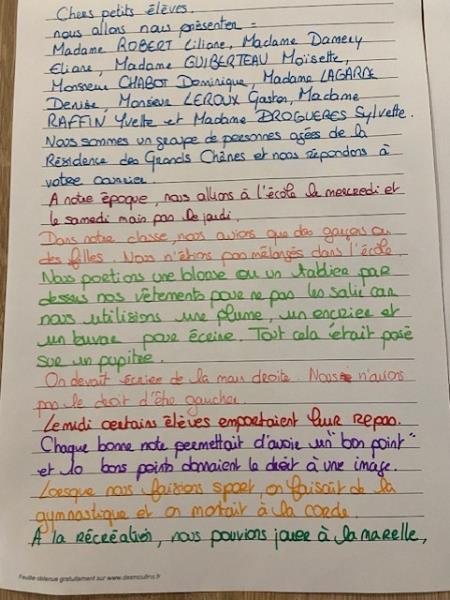 Les élèves ont envoyé un courrier expliquant l'école d’aujourd’hui avec de jolis dessins. Les résidents ont raconté l'école d'autrefois en retour. Plein de souvenirs ont ressurgi: