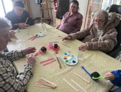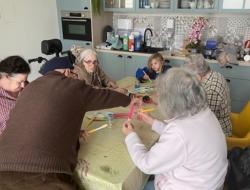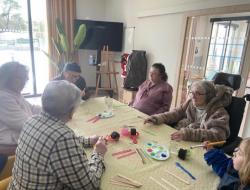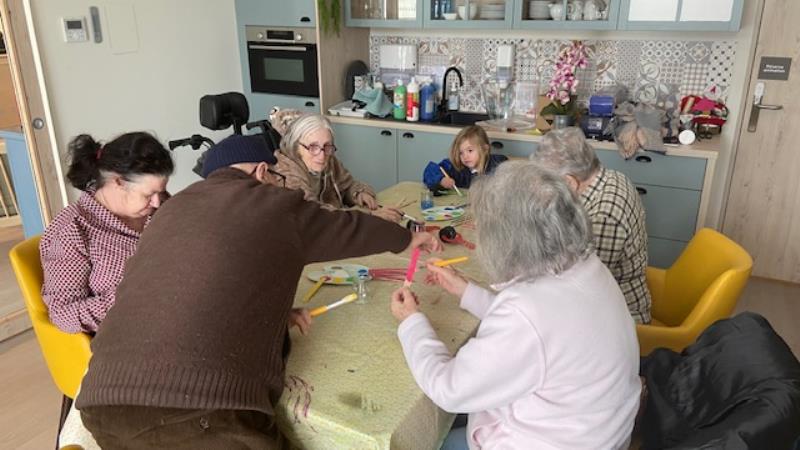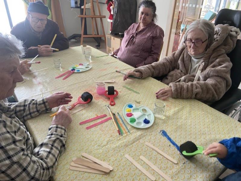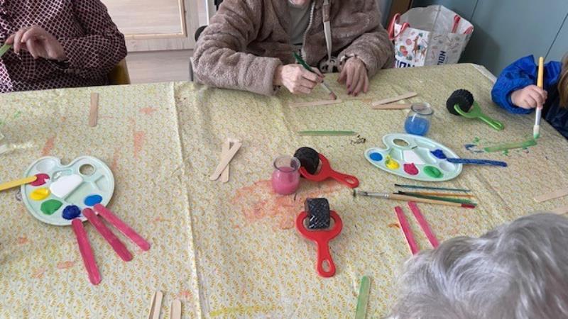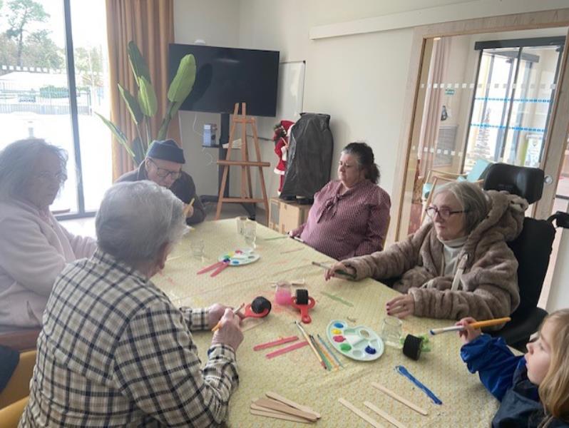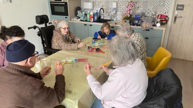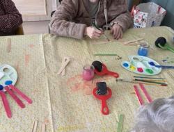 Certains résidents ont confectionné des décorations sur le thème du ski à travers des activités de peinture en compagnie d'une petite fille venue passer un moment convivial , favorisant les échanges intergénérationnels.