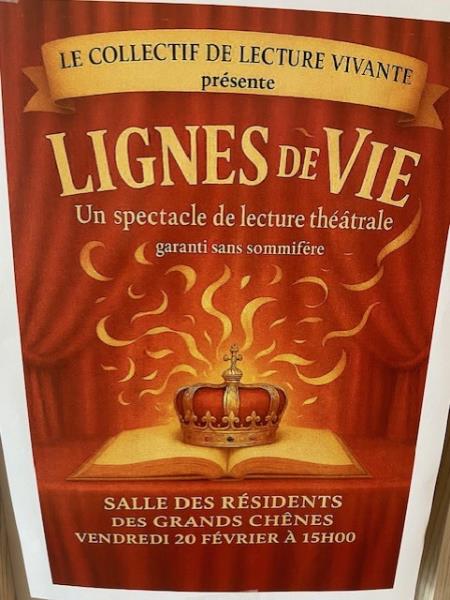 La résidence a eu le plaisir d'accueillir le Collectif de Lecture Vivante pour la présentation de " Ligne de vie", un spectacle de lecture théâtrale. Les résidents ont pris beaucoup de plaisir à écouter les différentes scènes, interprétées avec dynamisme.